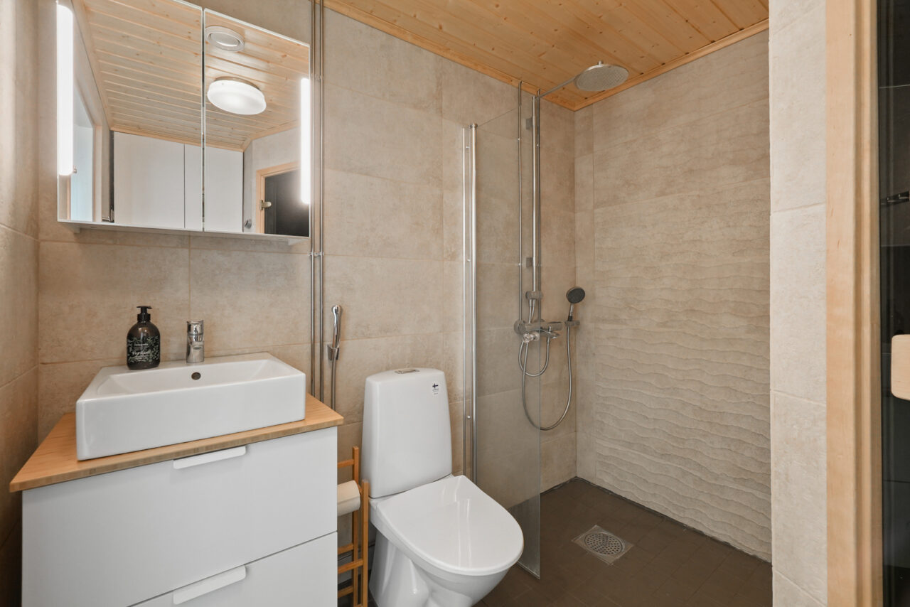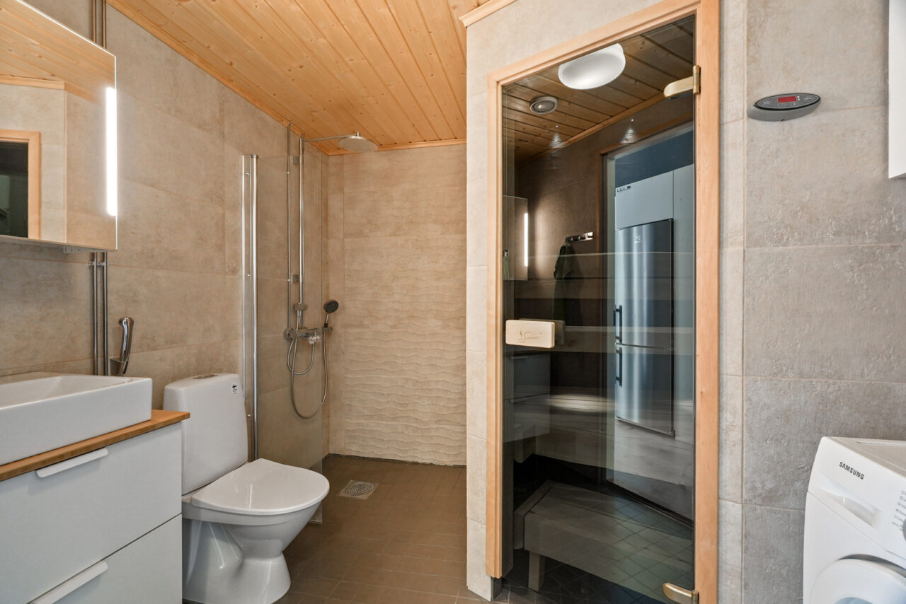 • Kylpyhuoneen seinämateriaali: kaakeli