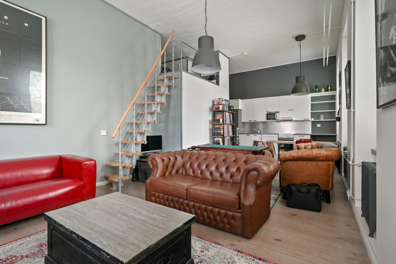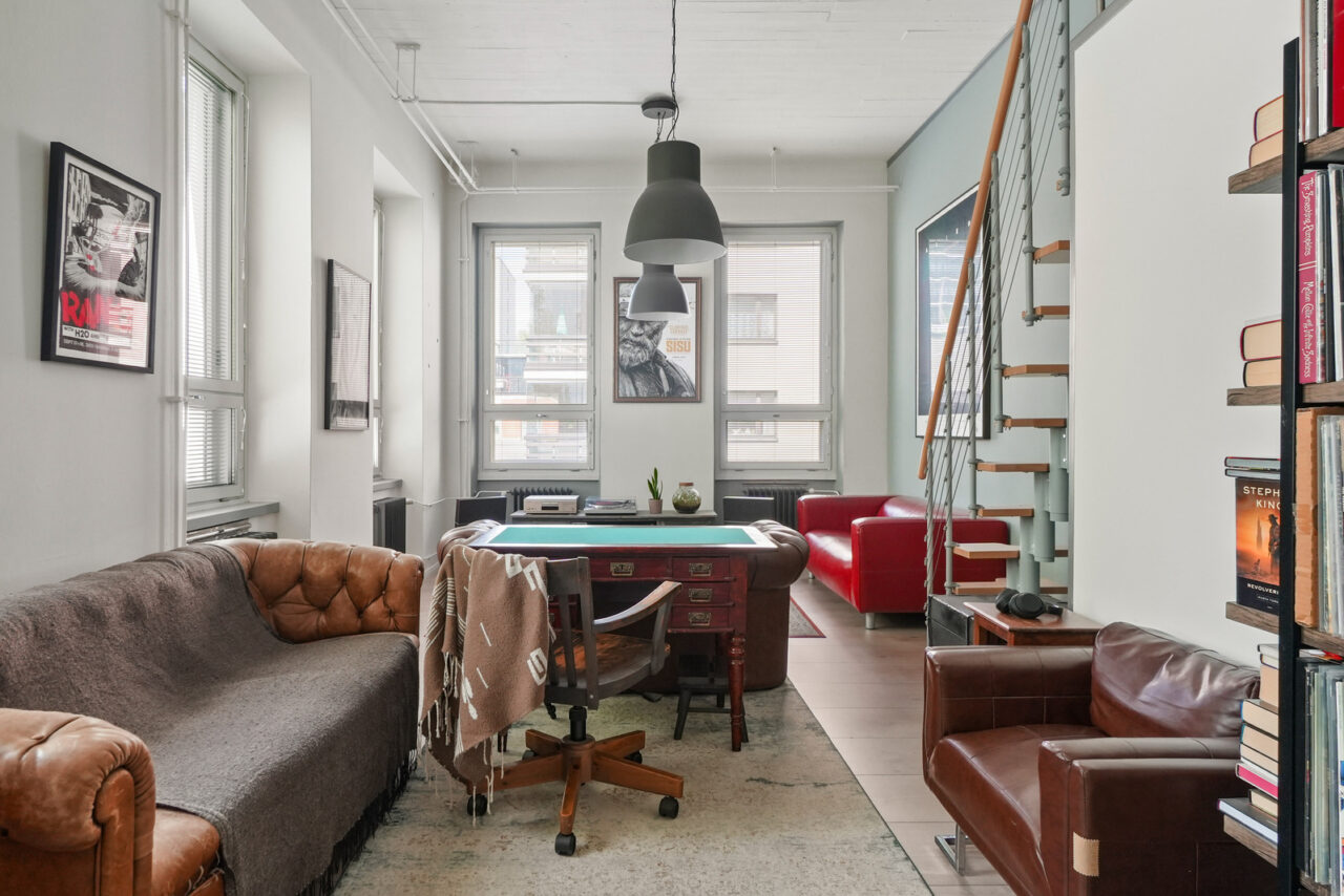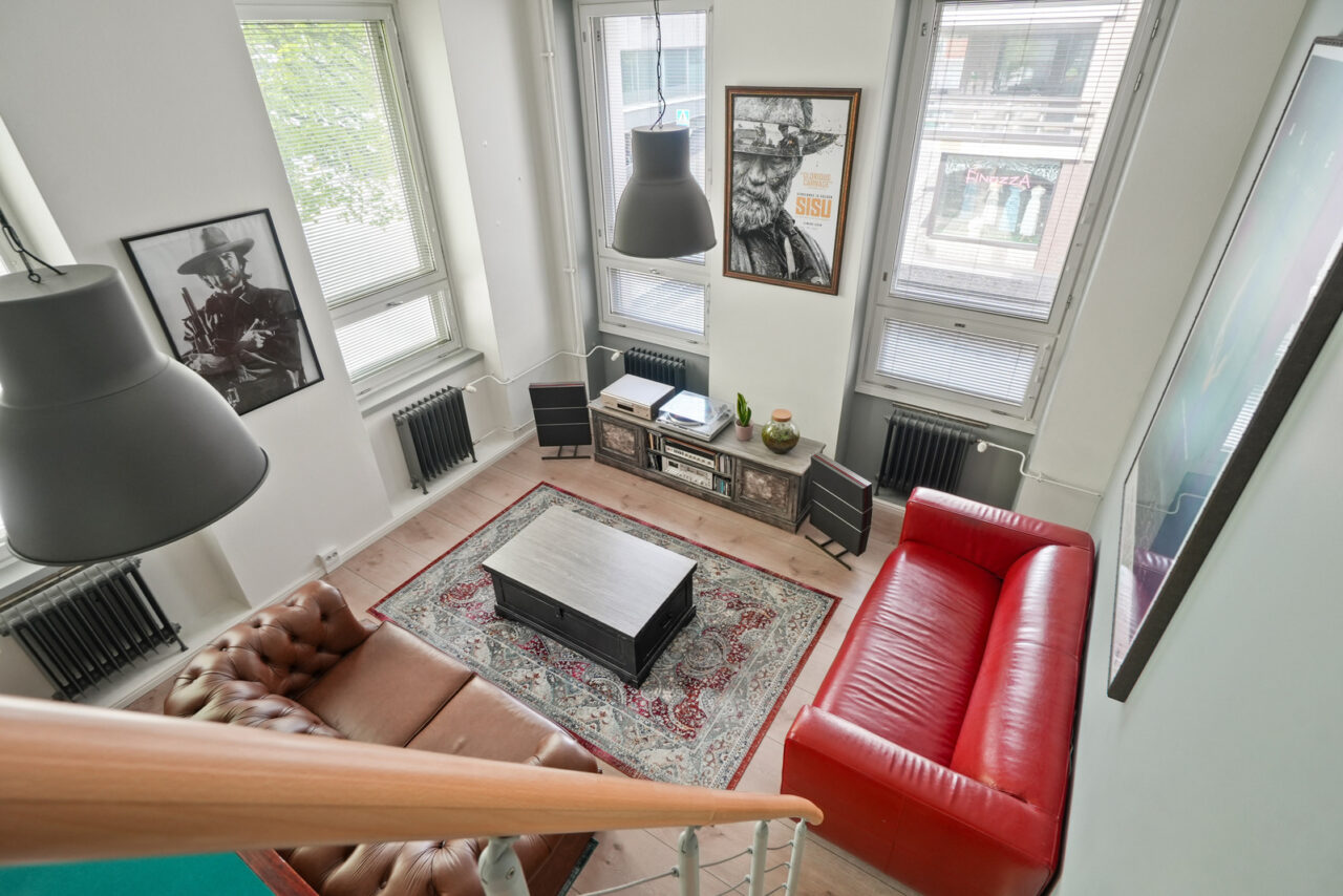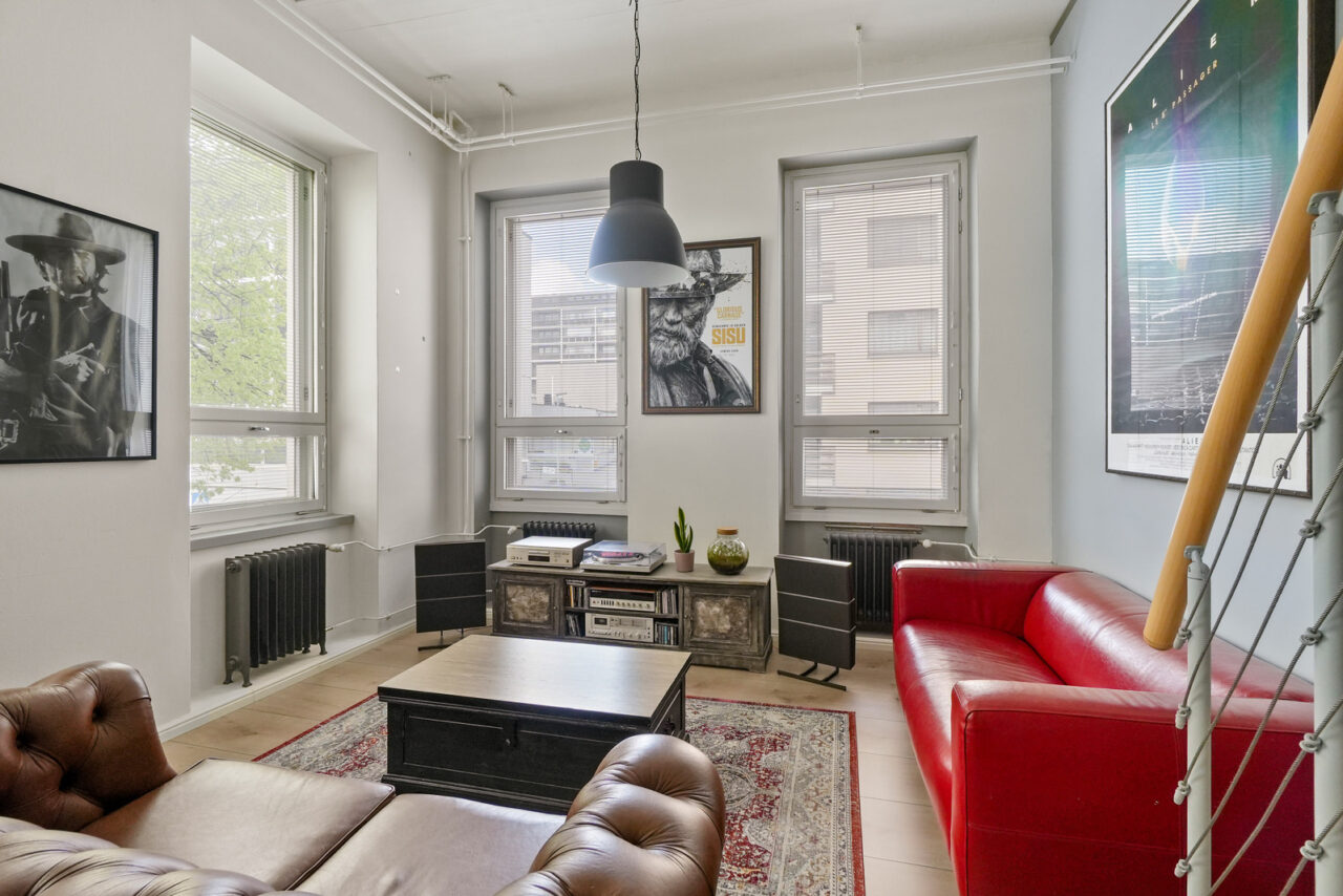 Mahtava huonekorkeus ja kahteen suuntaan olevat ikkunat tekevät tästä asunnosto kokoaan suuremman tuntuisen. Seinät huokuvat Hämeenlinnan paikallishistoriaa.