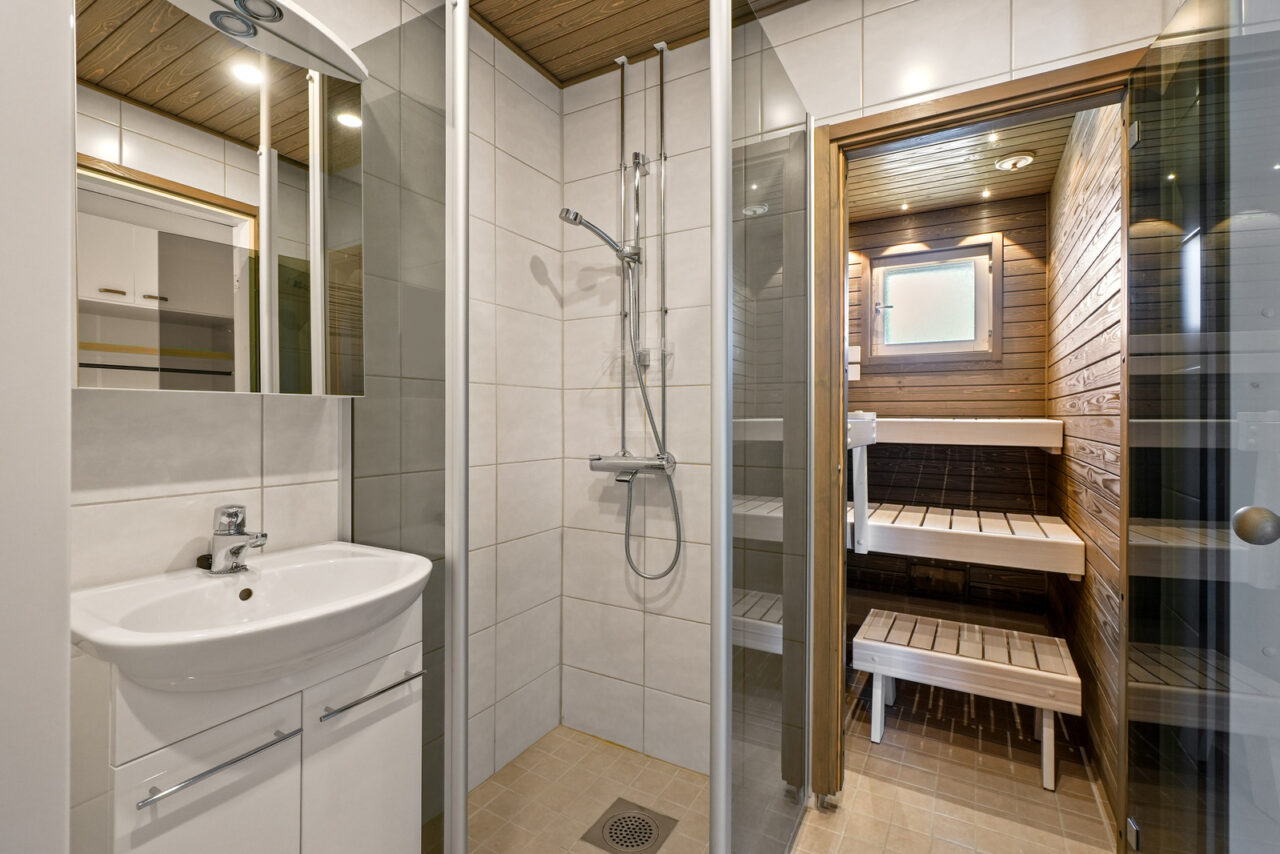 • Kylpyhuoneen seinämateriaali: kaakeli