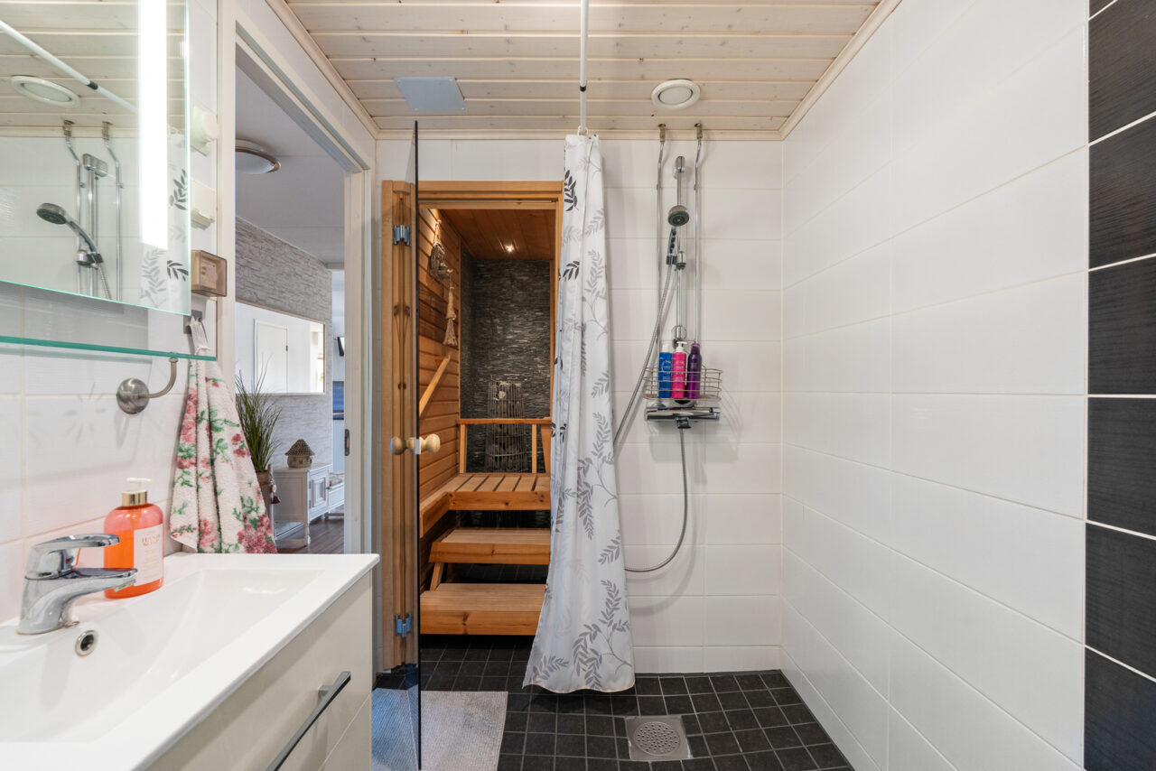 • Kylpyhuoneen seinämateriaali: kaakeli