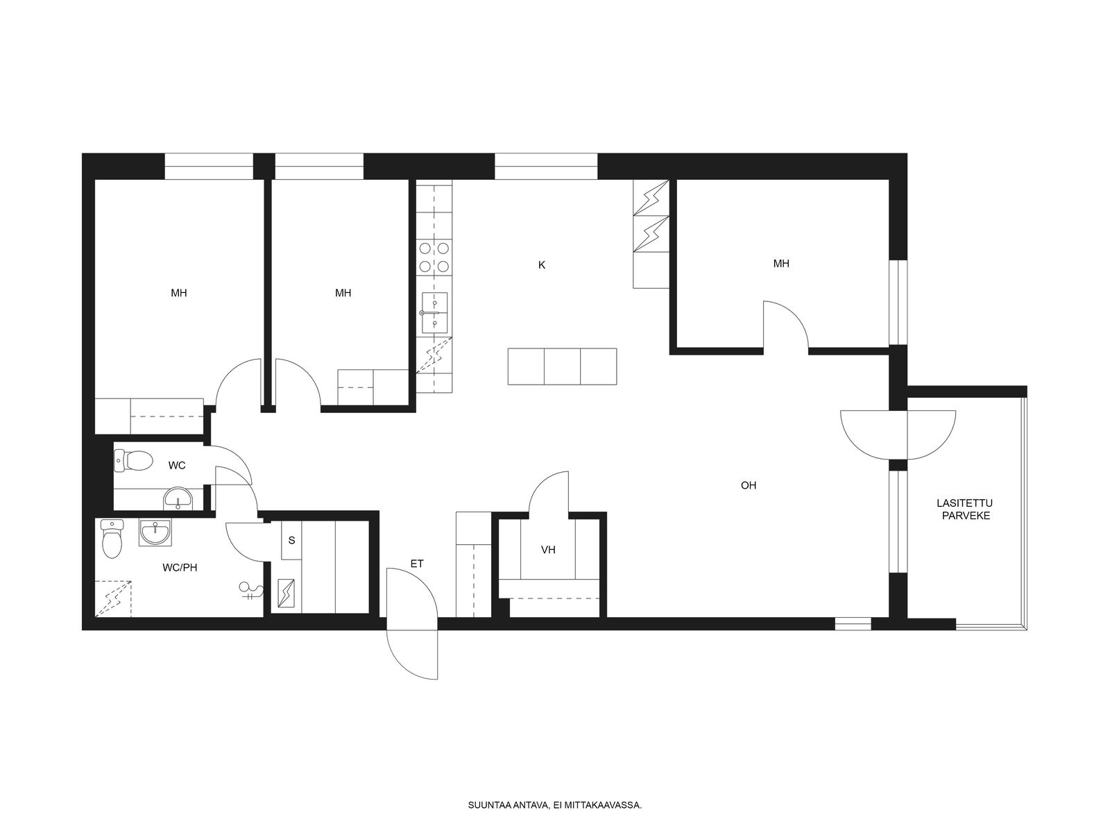 • Huoneistoselitelmä4h, k, s, 2 x wc, vh, lasitettu parveke